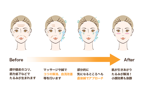 肌荒れ・浮腫み・クマの改善、リフトアップ、ほうれい線の軽減、肌のくすみの改善など様々な効果が得られます