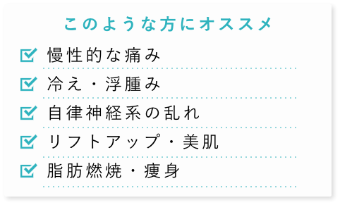 また、痩身・ターンオーバーの促進など美容効果も高く様々な施術が可能となっています。